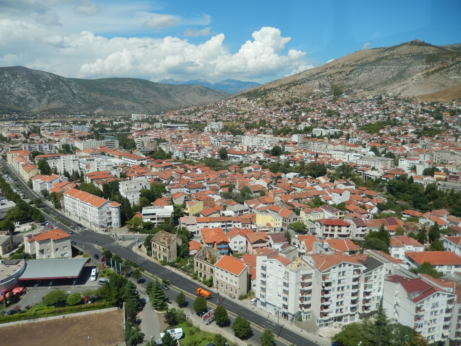 Meillä oli peräti kolme opasta mukana; oma oppaamme, yksi paikallisopas Kroatiasta ja nyt joukkoomme liittyi vielä Mostarin paikallisopas. Kävelimme heidän perässään vanhaankaupunkiin; kaupunki ei vaikuttanut todellakaan mitenkään suurelta, vaikka täällä yli 100 000 asukasta olikin. Tavallisesti täällä sisämaan vuorten välisellä tasangolla oli keskikesällä päivisin +40 asteen lämpötiloja, mutta edellisyön ukkosmyrsky oli ulottunut tänne saakka ja jäähdyttänyt ilman miellyttäväksi. Myräkkä oli tainnut olla melkoinen, sillä kaikkialla oli irronneita puiden oksia ja muuta tuulen heittelemää rojua.